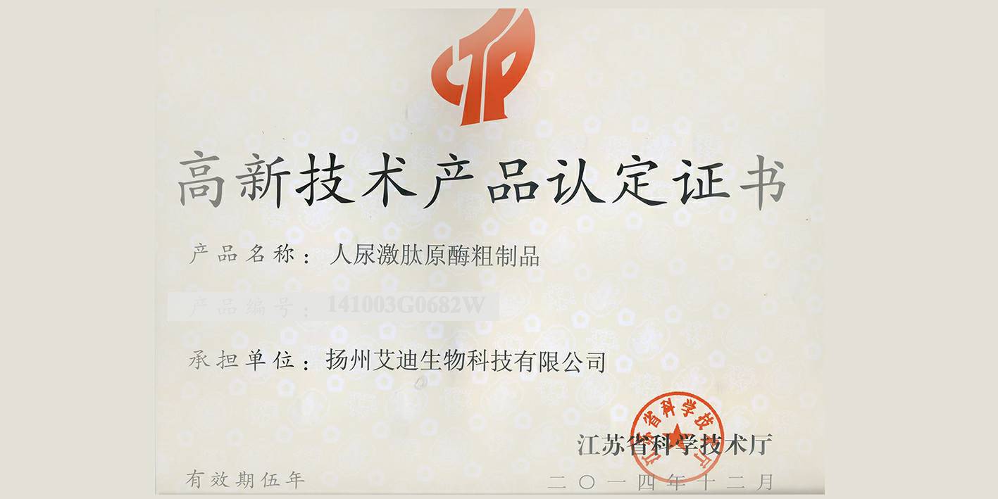 • 人尿激肽原酶粗制品获得2014年江苏省高新技术产品认定